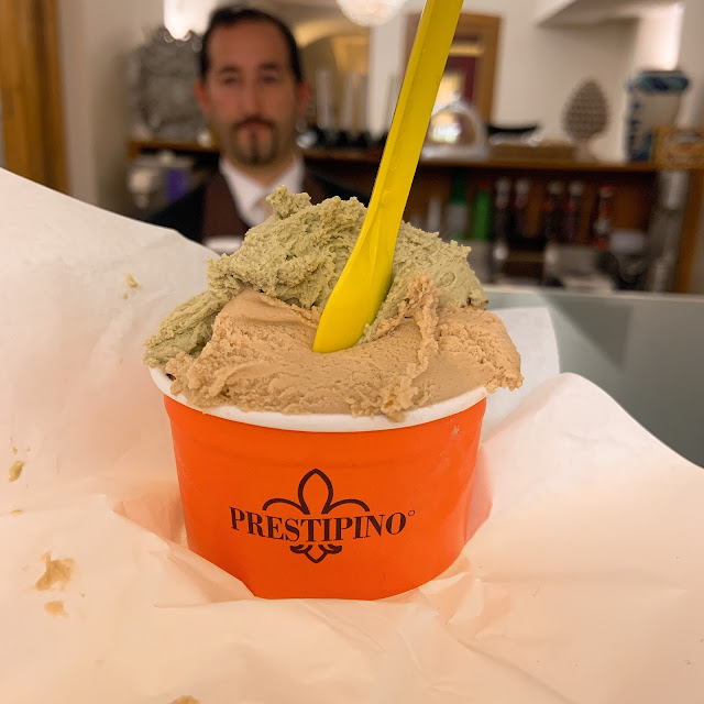 第二名是西西里Catania的老店Prestipino,店內裝潢華麗古老,客人很多,水洩不通,品項豐富,從甜點、糖果到鹹食。冰淇淋跟第一名水準幾乎伯仲之間,很濃郁、不會太甜,開心果口味永遠不敗。