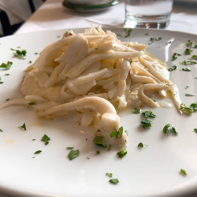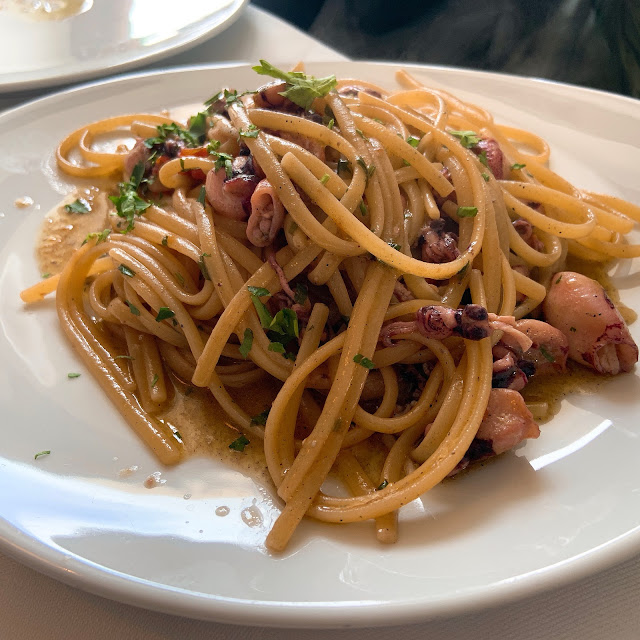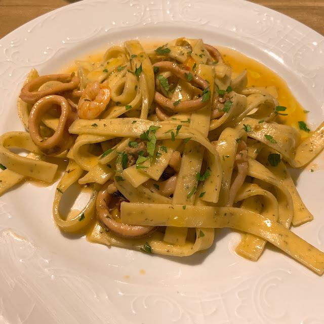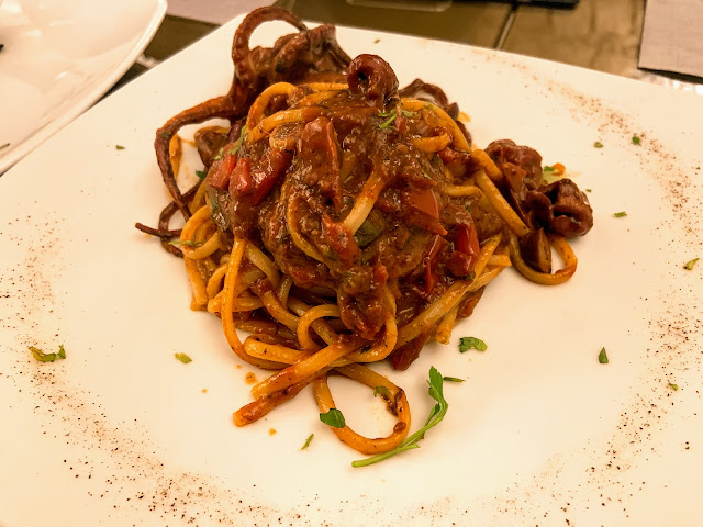 我們原本點的東西材料沒了,最後來了一盤章魚燉飯、一盤墨魚義大利麵、和醋溜馬鈴薯泥拌花枝,海鮮不太新鮮,馬鈴薯泥做成酸酸的也不合我胃口,他的強項是服務生真的很親切,讓人不忍苛責廚師的能力不足。