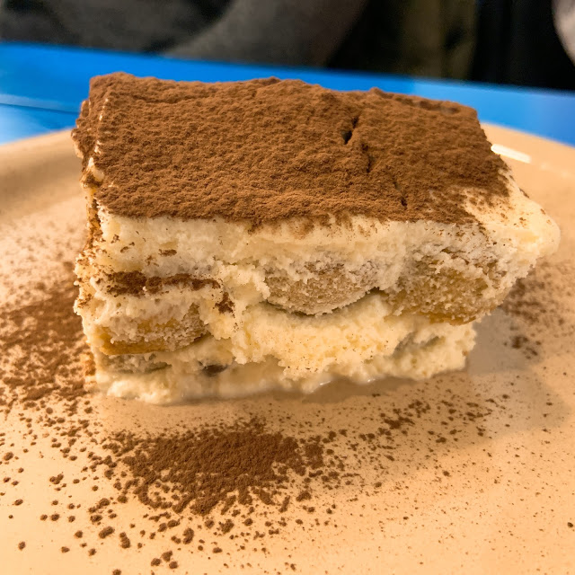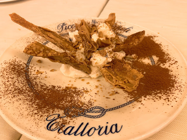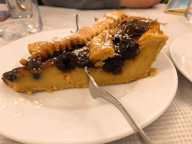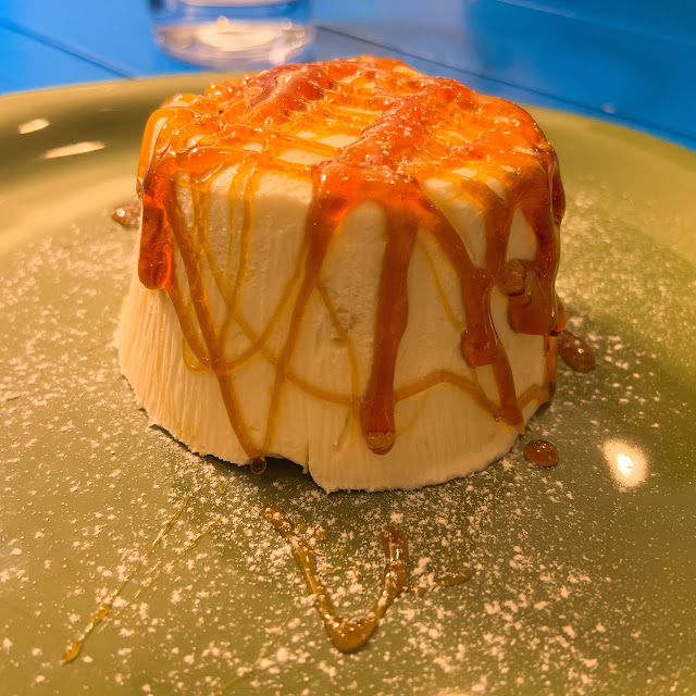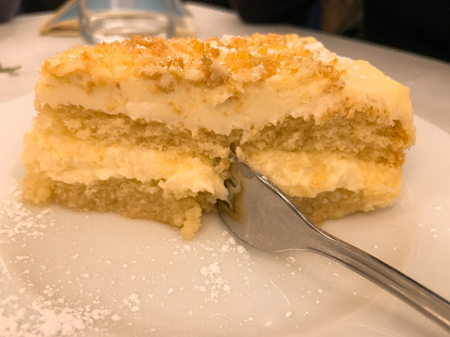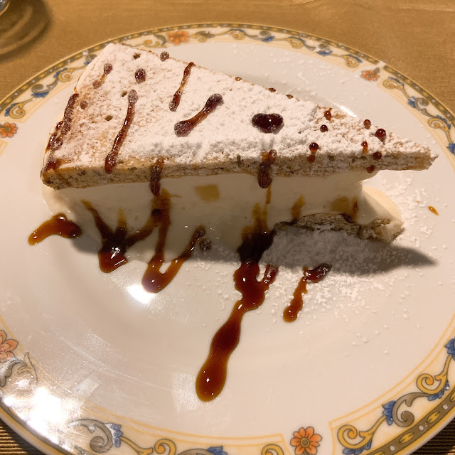 唯一的敗筆大概是甜點,服務生推薦了一道本地甜點,小鎮的英文水準差,說了半天我們也聽不懂是什麼,搜尋google圖片看起來像是提拉米蘇的白色版,我們就點了,結果跟圖片差很遠,是一樣杏仁味很濃、質地很黏的布丁,不知道在吃什麼,難以欣賞。義大利的奶酪很好吃,但義式布丁還是不行,日本布丁才是王道。