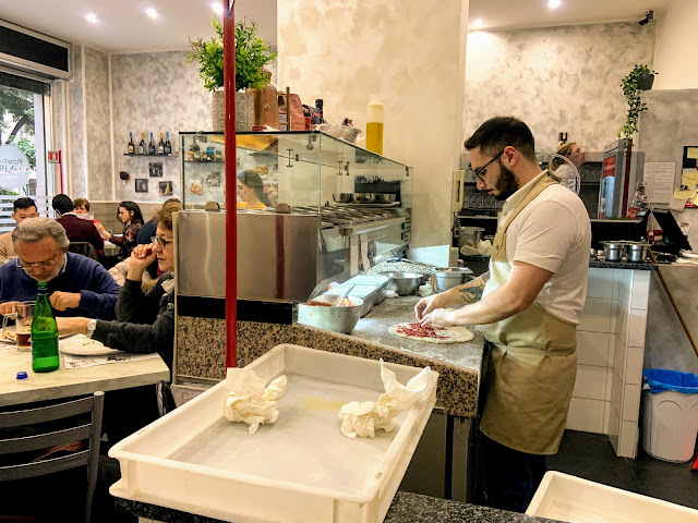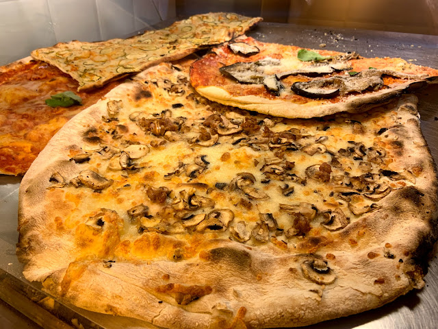 羅馬式披薩跟拿坡里式的不同,兩者麵糰水份、烤箱溫度、烤的時間都不一樣,羅馬式的麵團水分較少,烤箱溫度較低,烤的時間比較久,套句現在的話,羅馬式就是低溫慢煮,拿波里式麵團水分較多,烤箱溫度較高,烤的時間比較快,所以羅馬式餅皮又薄又脆又乾,拿坡里式餅皮又厚又軟又濕,我比較喜歡羅馬式披薩。