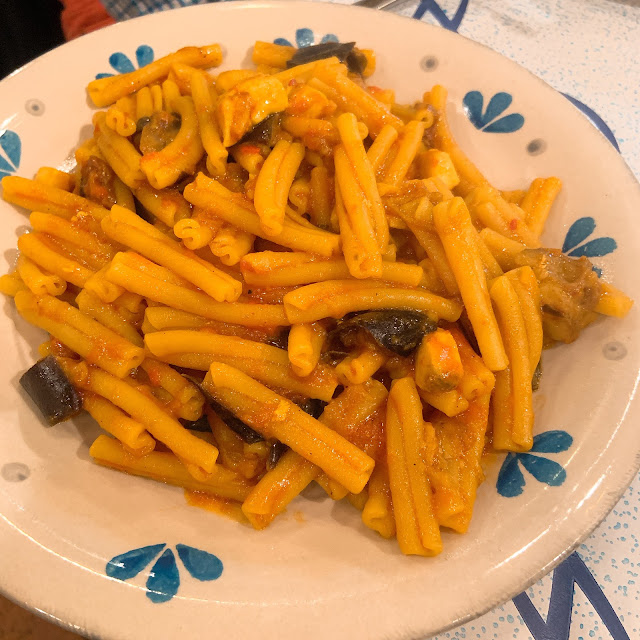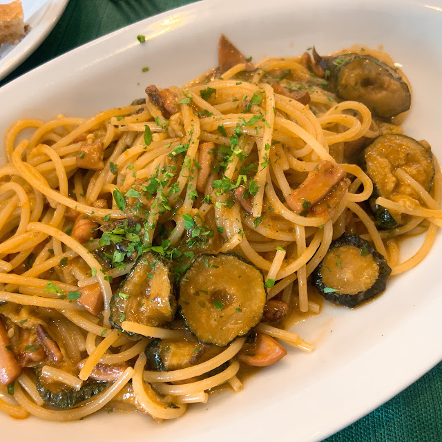 Trattoria Al Vecchio Club Rosanero是家運動酒吧風格的餐廳,有很多球衣球具等等,也有很多電視播放比賽,感覺是像炸豬排/拉麵一樣以男性為目標客群的餐廳。它同時非常local,服務生完全不說英文,快關門了他們也懶得招呼,菜單隨便寫在白板上,全義大利文,時間緊迫,我們又亂瞎點一通,點了肉醬麵、海鮮飯、烤花枝跟茄子麵。