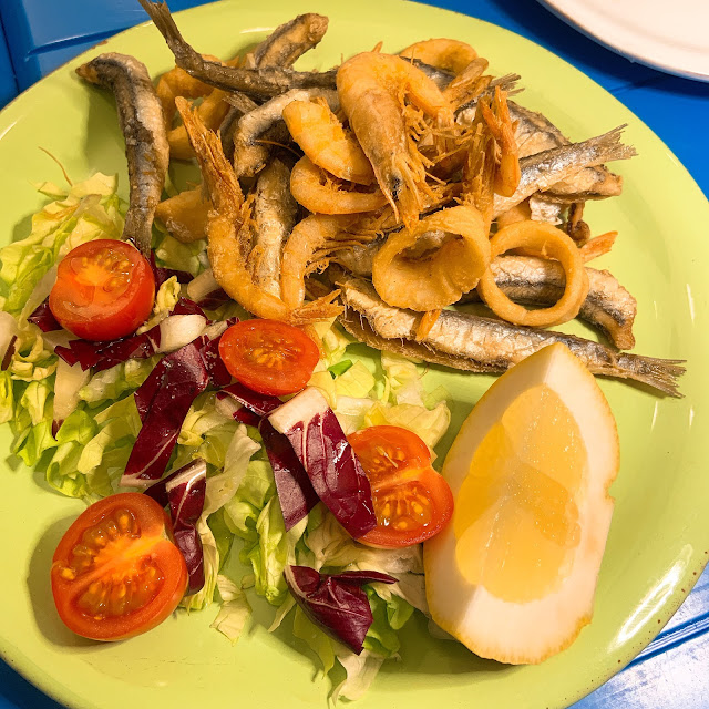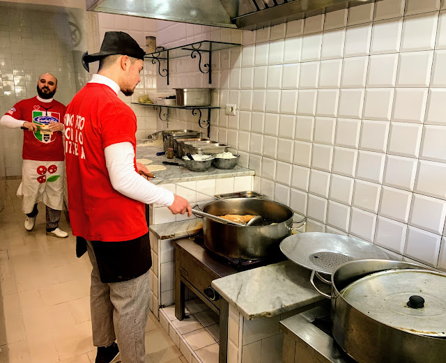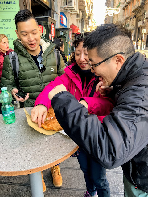 那是家像阿忠麵線一樣local的小店,菜單在牆上,只有義大利文,櫃台排隊點好就在旁邊現炸,炸好就站在店外面街上吃。