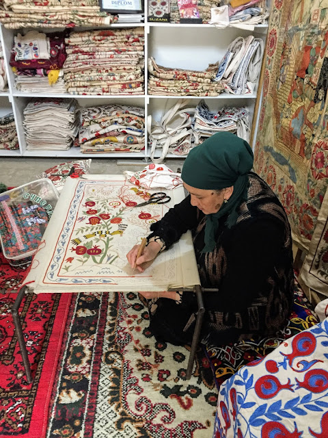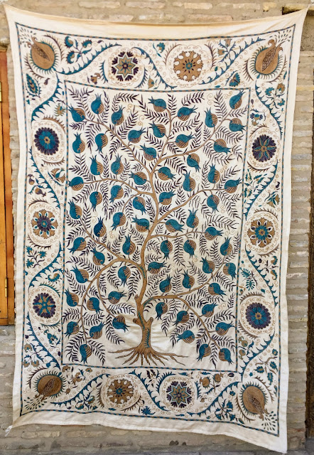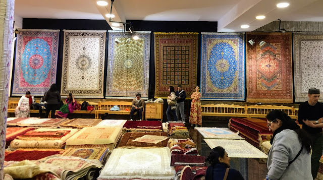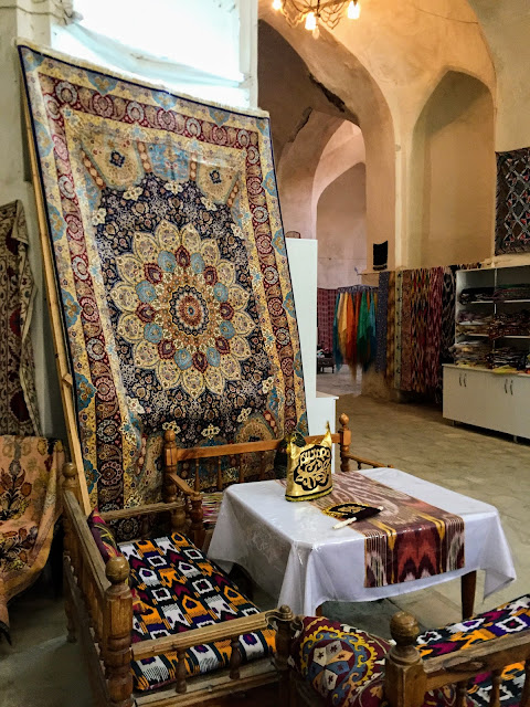 布哈拉的波斯地毯也很美,感覺坐上去就可以飛起來,有好多家規模很大的地毯手作工坊,還可以看當地婦女編地毯,可惜台灣潮濕炎熱的天氣真的不適合掛地毯,只能看看。