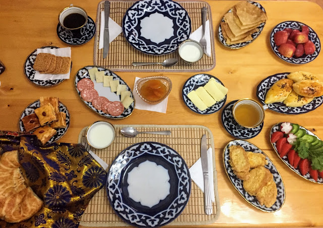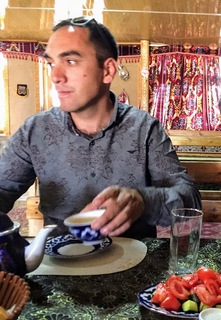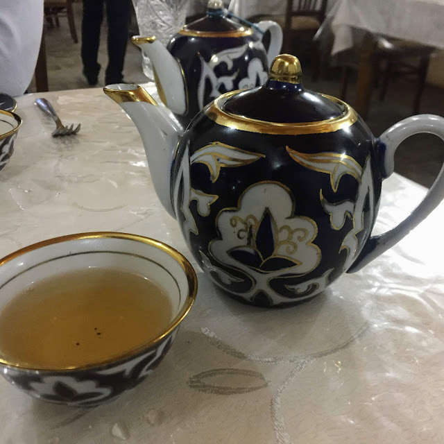 喝綠茶是烏茲別克人的日常,每餐都要喝,路人沒事也都用漂亮的茶具在家門口悠閒喝綠茶聊天,但他們的綠茶我跟我朋友一致認為很淡很難喝,紅茶稍微好喝一點點,但不是他們的主流,在這裡可以了解到為何古代外國要跟中國買那麼多茶葉,東亞的綠茶無論味道或層次都大勝。