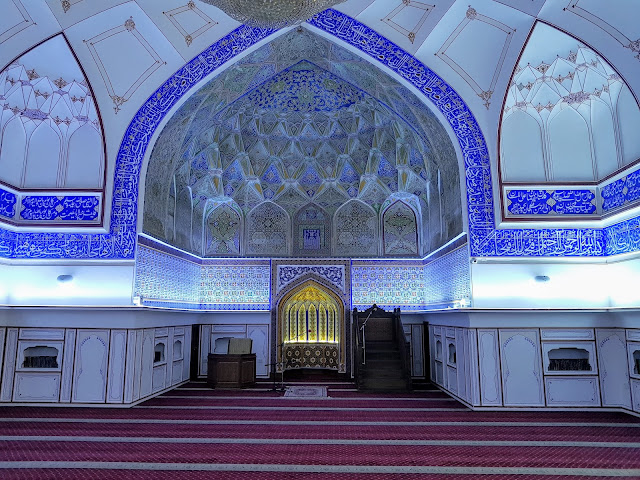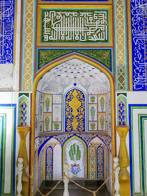 進去之後發現他們有大約6-7個包頭巾婦女,和一位主持儀式的男士,正要開始進行某種禱告儀式,因為他們已經叫我坐下來了,語言不通,騎虎難下,只好被迫參加了他們的禱告,聽他們吟唱聽不懂的詩歌,嘗試著融入一下大家身心靈的狀態,順便觀察美麗的清真寺內裝,因為都聽不懂,感覺有點格格不入,接著就發現婦女們都有包頭巾,只有我沒有包,在土耳其女生沒包頭巾是絕對不能進清真寺的,但看來在烏茲別克大家都沒有很在意,是他們自己一直邀我進來的。
