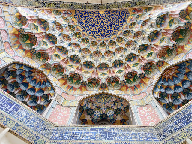 水池旁邊最漂亮的建築是東面的Nadir Divan-Beghi經學院,大門上的馬賽克鳥花紋非常華麗,再度打破了伊斯蘭教不用人物花鳥裝飾的規則,驗證了伊斯蘭教在當地深受拜火教的影響。
