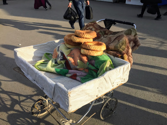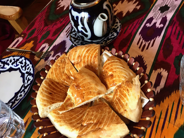 烏茲別克的麵包一個重達兩公斤,乾乾的不太好吃,麵包上面有押花,據說根據壓花就可以判斷來自何處。一個重達兩公斤。根據傳統,如果發生戰事,出征的軍人出門前會吃一口麵包,家人會把缺了一角的麵包掛在家中,等到男人回來繼續吃為止。