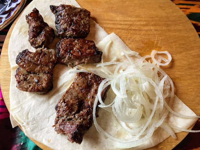 烤肉串是烏茲別克另一樣主食,烤肉怎麼會難吃呢? 因為他們的肉質很雞肋,牛肉還有種處理不好的血腥味,只有一次在布哈拉附近的Gijduvan瓷器手作坊吃到的烤肉串比較好吃。