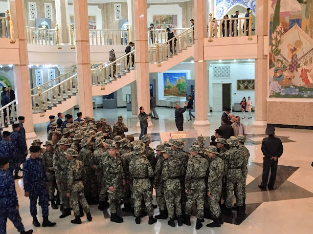 Amir Timur Museum是介紹帖木兒和中亞歷史的博物館,在凱悅酒店附近,在一個花園中央。這一區有種楚門的世界的氛圍,馬路很寬很漂亮、整排行道樹,但路上一條車都沒有。在逛博物館時遇到了軍警博物館參觀日,看到了各式各樣制服的軍人。