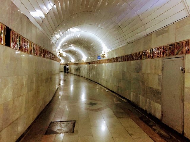 塔什干是烏茲別克唯一有地鐵的城市,地鐵是塔什干的神秘傳說,因為他是禁止照相的,相傳蘇聯時代建造的地鐵站內裝非常豪華,不過還是有些偷拍照流出,我也不免俗偷偷摸摸偷拍了一張,本人有種美人遲暮的氣氛,跟大部分實用主義的地鐵站比起來,整排水晶燈確實十分華麗。