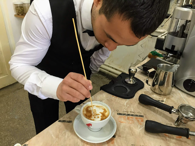店員很認真的畫拉花,看來這家咖啡店是來真的。