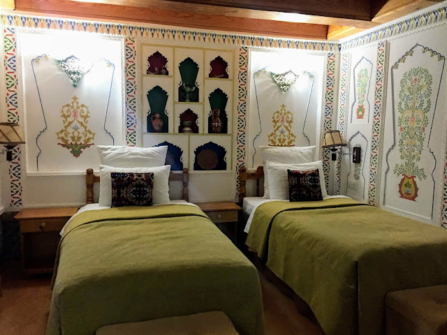 布哈里的旅館Amelia Boutique Hotel美感又更獵奇,用很簡陋的材料大膽打造出建造者心中綺麗的波斯世界。布哈拉酋長國夏宮裡面華麗的牆,我們旅館房間和餐廳都有複製一面。