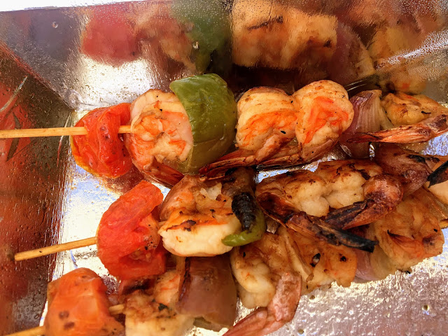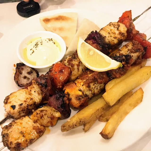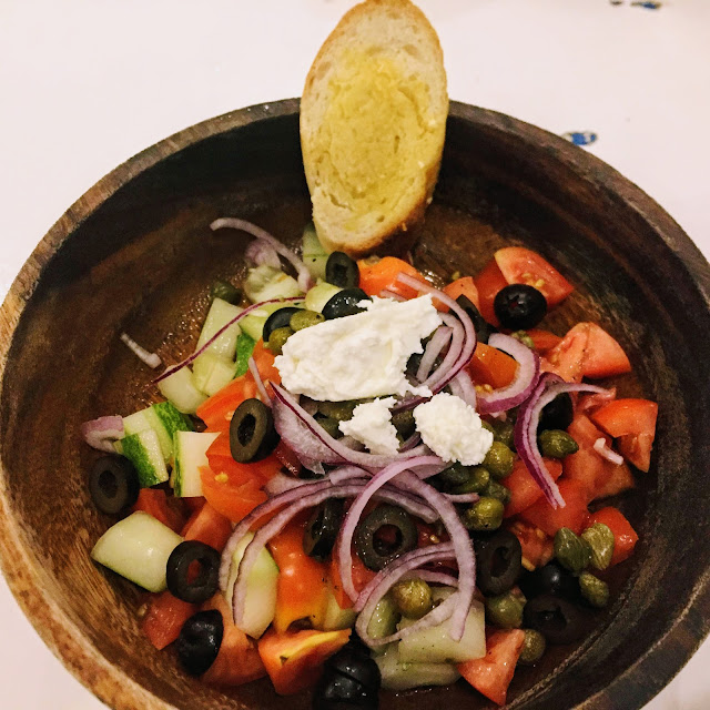 海邊熱鬧的餐酒館,我們隨興走進,點了店員推薦的招牌海鮮串烤,學隔壁桌點了希臘沙拉,兩樣都非常美味。