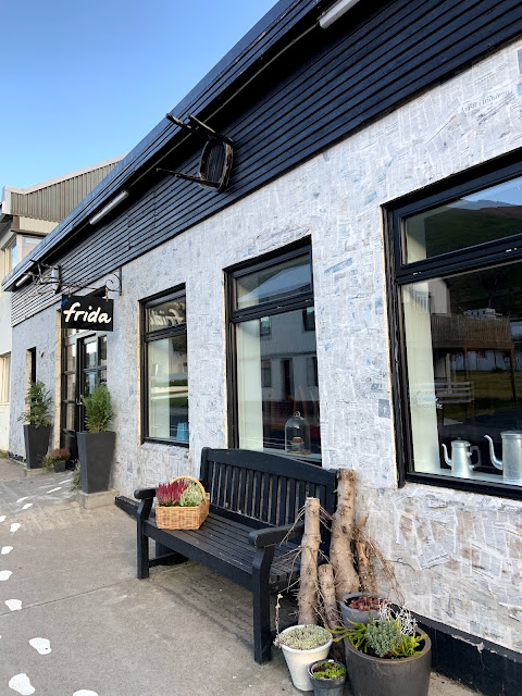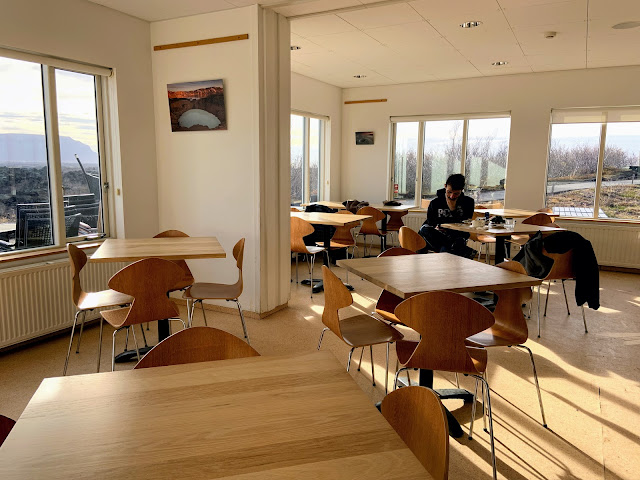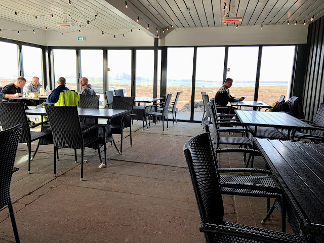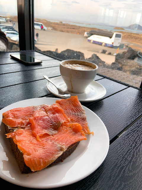今天午餐很有記憶點,在黑色城堡旁邊有落地窗的玻璃屋咖啡店【Kaffi Borgir】吃煙燻鮭魚配火山麵包。冰島的煙燻鮭魚真的煙燻味超級重,相比之下我們平常吃的煙燻鮭魚都顯得不夠力,火山麵包是用地熱烤出來的,很黑、孔隙很小,質感與眾不同,是麵包界的火山硬漢。朋友點了三種湯自助餐,也讚不絕口。
