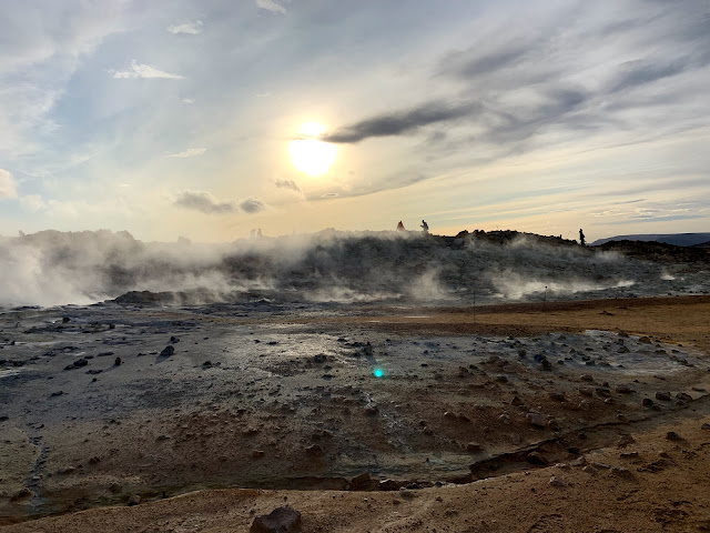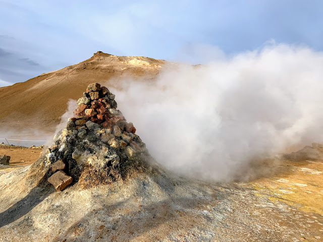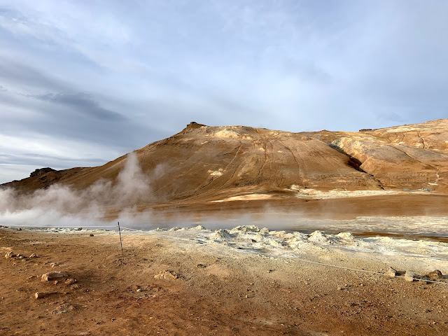 早上先去了一個類似月世界+小硫坑的景點【Námaskarð】,滿地都是冒煙的硫磺,地表寸草不生,地皮被礦物染成紅色的,煙霧繚繞中彷彿看到中國山水畫。