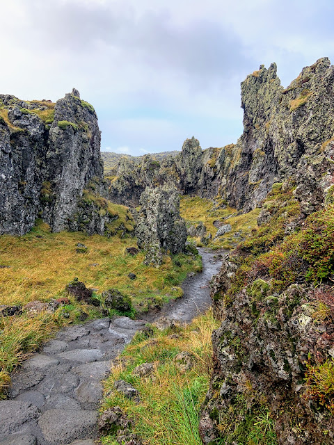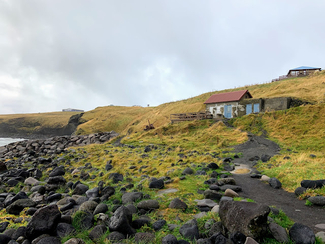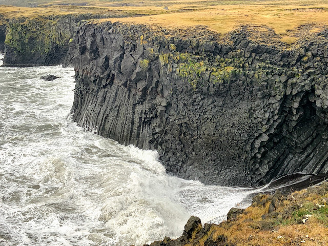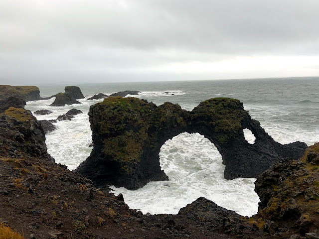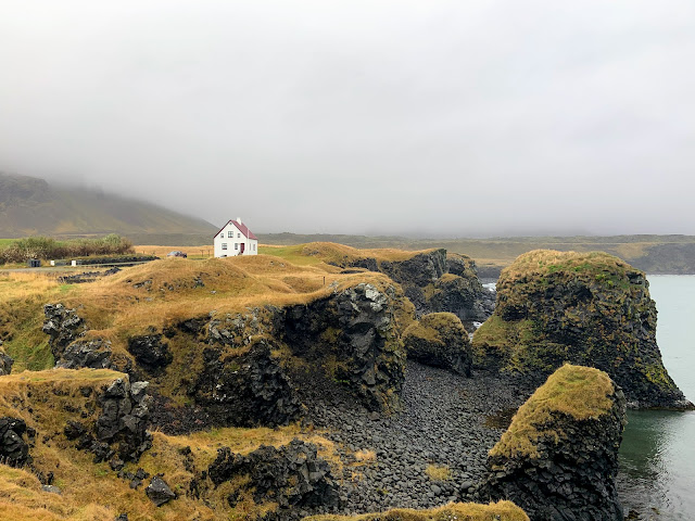 Arnarstapi和Hellnar之間有條2.5公里的海岸步道,導遊叫我們把行李放在飯店,健行去Hellnar,海邊很多漂亮的地形和岩漿,雖然飄著小雨,不過我還蠻喜歡那段健行的。本來很期待可以去步道結尾的【Fjöruhúsið café】喝咖啡,但它冬季休業。