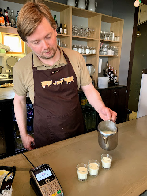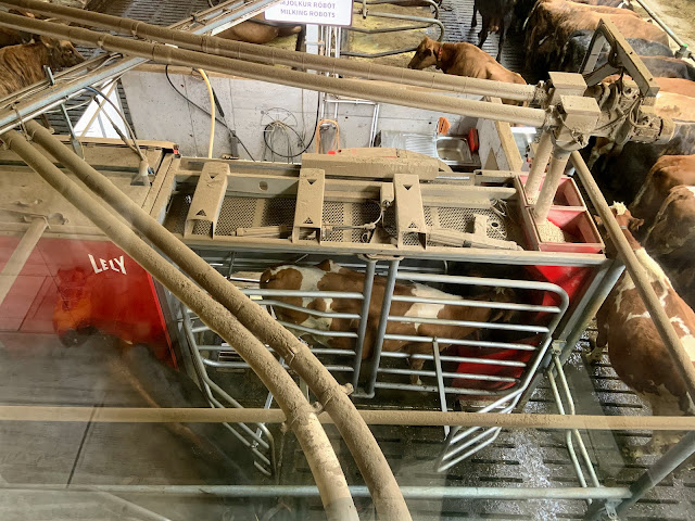 然後去了有驚豔到我的牧場和咖啡店【Kaffi Kú】。去之前導遊跟我們介紹,冰島的牛是有牛權的,牠們一年有2個月有權利可以待在戶外,在室內的時候也有走路的權利,牠們想被擠奶的時候可以自己走去被擠奶,牠們當然不會想被擠奶,牠門主動走去是因為擠奶機那邊有零食可以吃,因為他們過得比較快樂,所以一天可以擠四次奶,比一般的牛只能擠兩次奶多。