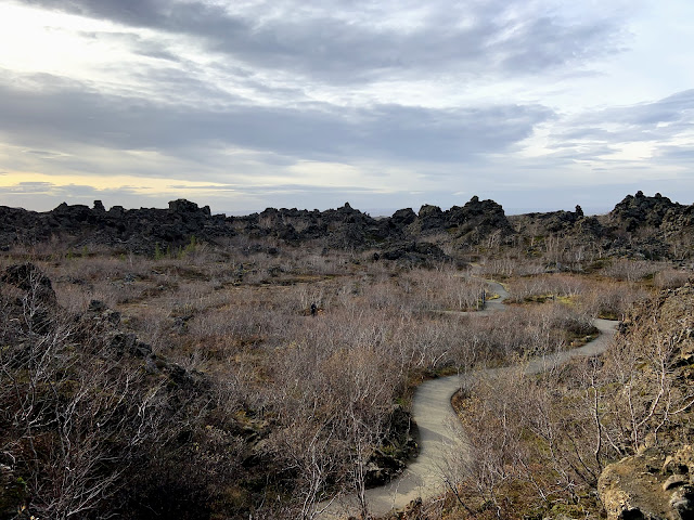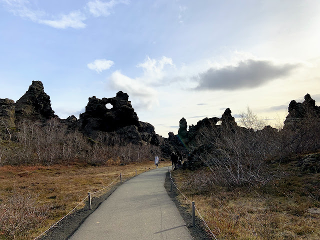 第二個健行【Dimmuborgir黑暗城堡】則非常輕鬆寫意,是一個公園,繞一圈大約2公里,裡面有各種火山爆發後形成的奇形怪狀巨大熔岩,是冰島版聖誕老人 - 13個Yule Lads精靈居住的地方。