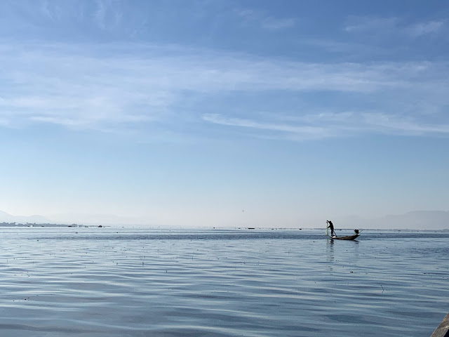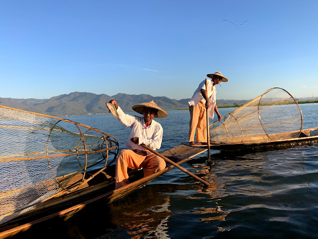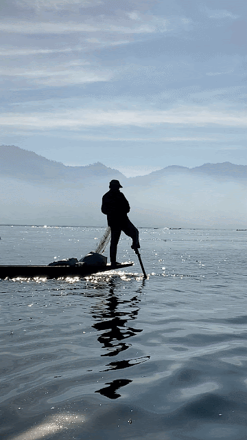 在湖上也可以看到真正的漁夫在捕魚,真正的漁夫不會跑來收錢,也不會理你愛怎麼拍照,自己補自己的,他們會用一種比較垂墜的漁網,不像專業舞者是用一個造型浮誇比較上相的大竹簍。