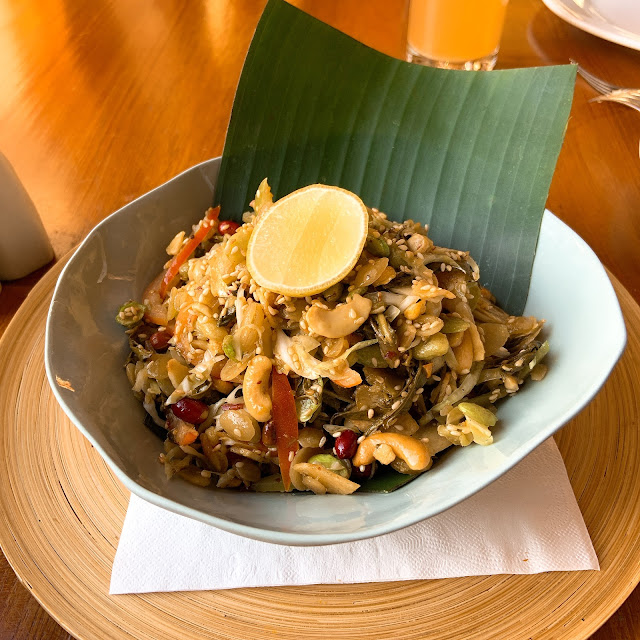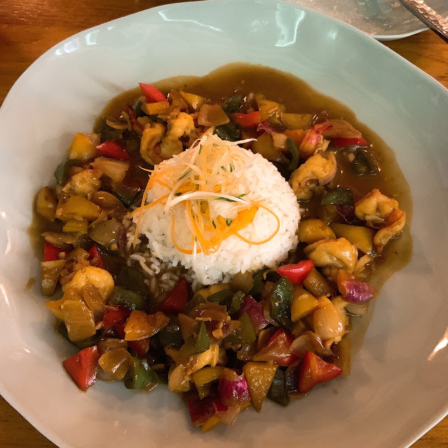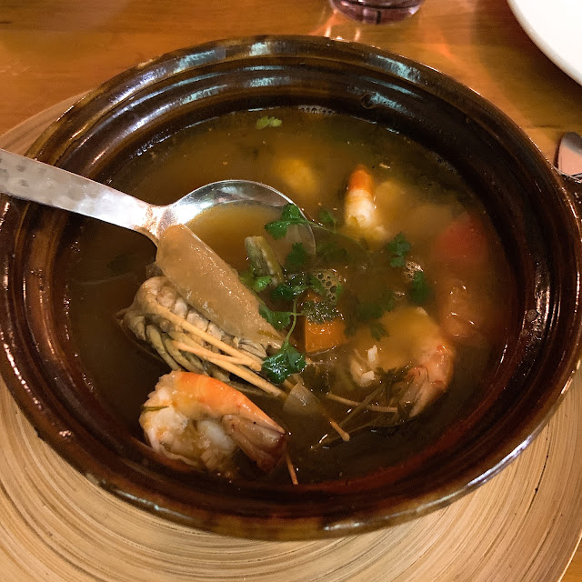 飯店餐廳雖然美但不是很好吃,我一餐吃了冬蔭功燉飯、一餐吃了炒蝦,冬蔭功燉飯普通,炒蝦有飛機餐的味道很可怕。與這個飯店高級的程度不成正比。這種地方也做不出像樣好菜,緬甸無美食果然名不虛傳。