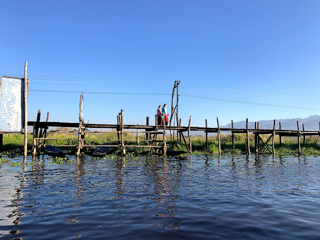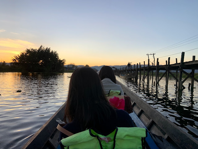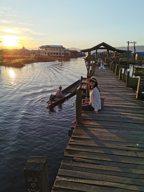 看完漁夫舞,導遊喜孜孜帶我們去看他的私房景點,在回我們飯店水道的木橋上拍夕陽,Inle Lake到處是這種橋,水上夕陽真的很美,沒有去到曼德勒的柚木橋,在這裡拍一拍木橋夕陽也不錯。