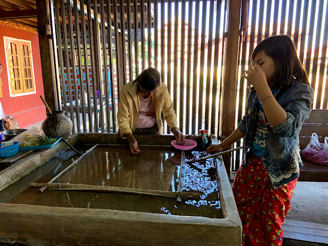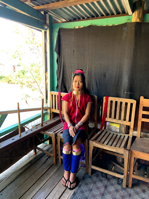 花瓣紙手作工坊裡面還有兩位長頸族坐在門口,導遊解釋了長頸族的由來,長頸族的婦女原本住在山上,平常會把物資用一條帶子背在頭上,上山下山,頸部容易受傷,所以就發展出在脖子上裝一圈一圈金屬環的習俗,讓頸部能承受更大的力量。久而久之頸部變脆弱,反而需要加越來越多金屬環,所以年紀愈大,頸上的環越多。現場有兩位女生,一個年輕,一個年長。年輕那位看起來就像一般女生帶了比較多項鍊,年長那位金屬環非常多,整個身體呈現不自然的比例,令人唏噓。導遊說他們其實不是脖子變長了,是肩膀以下身體往下塌。