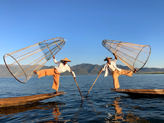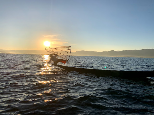 日落時分在夕陽下看漁夫舞是Inle Lake的另一個大重點,Lonely Planet緬甸的封面就是Inle Lake的漁夫舞。此地漁夫為了空出手來捕魚,發展出用腳撐槳的技能,像跳舞一樣,遊客很喜歡拍,衍生出專門跳給觀光客看的假漁夫真舞者行業,跳完會來收小費,導遊說一位漁夫3,000緬元(約2美金)。