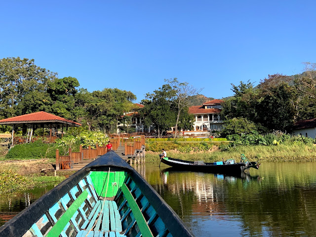 飯店距離機場搭車或搭船都是1小時。我們選擇了網路上推薦的搭船來飯店,稱做spectacular arrival by boat,飯店先派車把我們接到娘瑞鎮,從鎮上的碼頭搭船去位於Inle Lake的飯店。從機場搭船去飯店比搭車貴一點,蠻有趣的,因為我們那天都在等飛機誤點和搭飛機中度過,這趟水路就是我們那天的亮點了,不過後來發現其實隔天遊船也會體驗到從水路回飯店,不一定要多花錢搭船來。