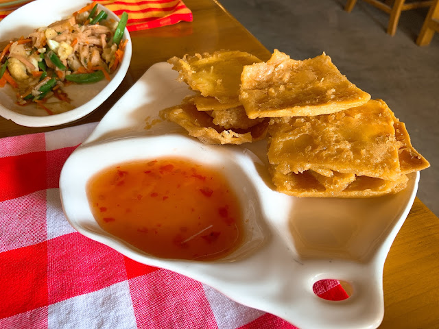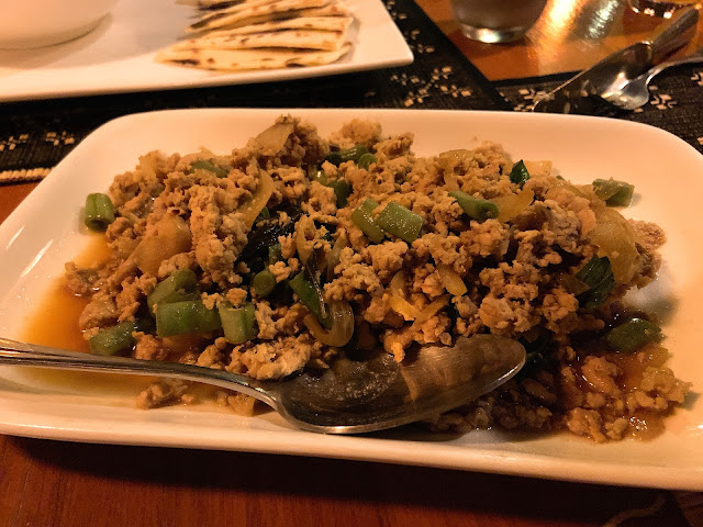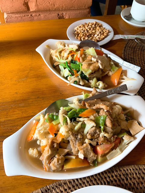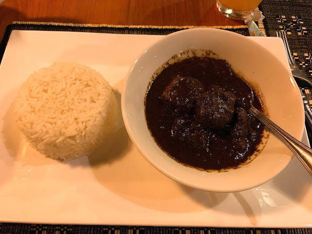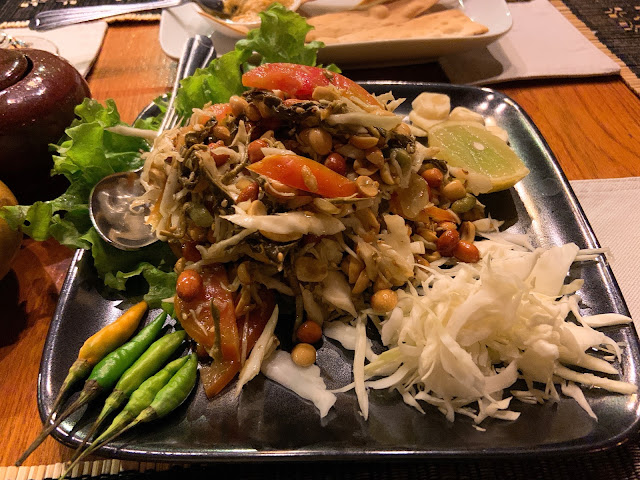 晚餐我們點了緬甸黑豆豬肉咖哩,黑得像墨汁,賣相十分有趣,豬肉非常硬。打拋豬有點平淡,印度咖哩雞很甜,茶葉沙拉是一道緬甸常見得料理,通常還算清爽可口,但這裡的茶葉沙拉很苦澀,不懂是在追求什麼。