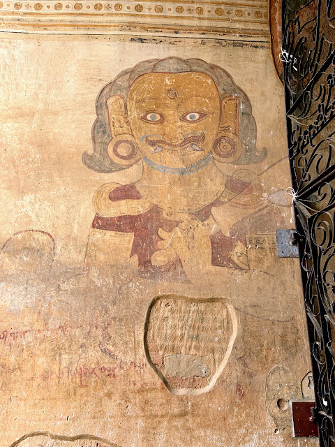 村莊走出一個男的打開大門帶我進去,廟裡面非常陰暗,他拿出手電筒一照,才看到牆上畫滿了一格一格小小的佛像,他帶我繞到正殿的後面,更陰暗的迴廊裡充滿了佛像浮雕,以及滿滿的小壁畫,隨著他的手電筒光線照到之處一一顯現,嘆為觀止,跟其他大同小異的寺廟比起來,參觀這個暗室寺廟的經驗非常有趣。