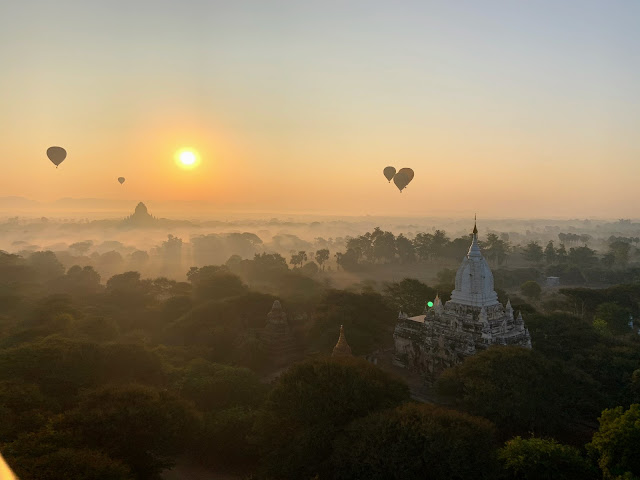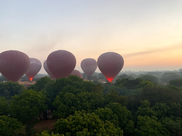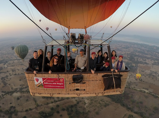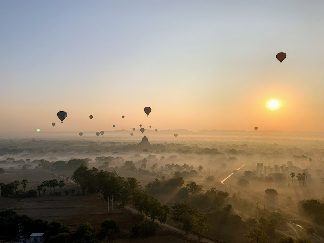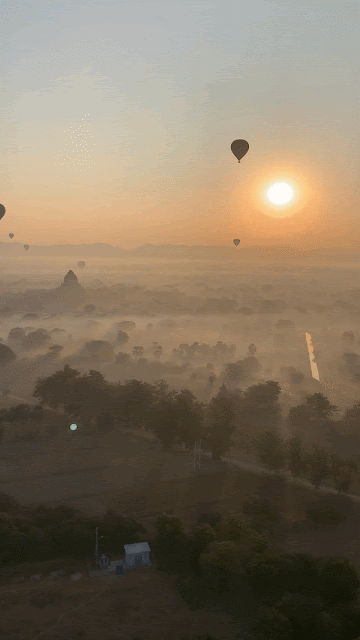 晨曦中星羅棋布的寺廟和熱氣球是蒲甘經典的景色,當初我也是被這張照片吸引想來緬甸玩的。蒲甘的熱氣球很貴,我們坐的Balloons Over Bagan公司16人一球的經濟艙起跳就是350美金,遇到聖誕節假期還要加價30美金,盛惠380美金一人,之前去土耳其Cappadocia坐熱氣球是158歐元一人,緬甸是土耳其價格的兩倍。