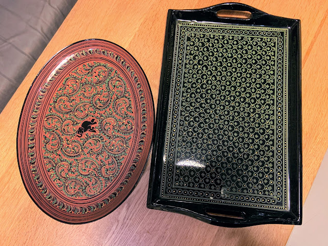 本店除了陳列一般漆器,還有一間禁止拍照的密室,裡面是比外面陳列的更高級的頂極漆器。以凹布景網美托盤為例,我們在Ananda Temple外面的地攤買的一個6美金,店裡陳列的中級品一個20美金,密室裡的頂極品一個高達80美金。