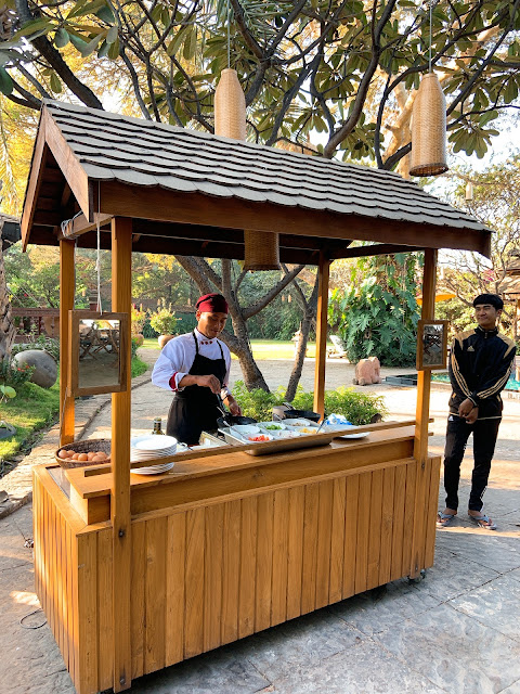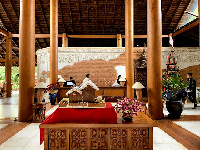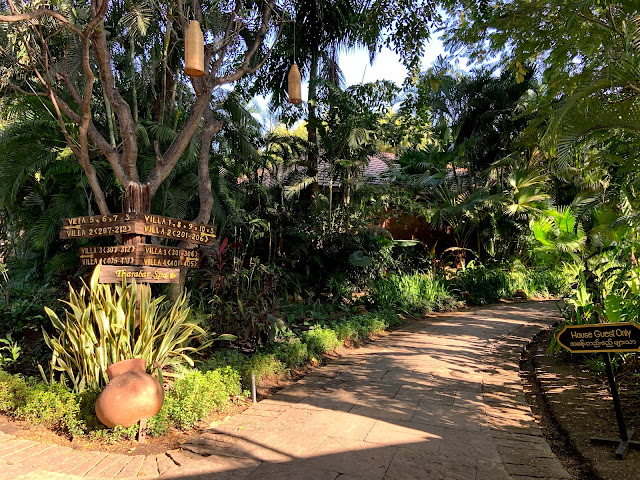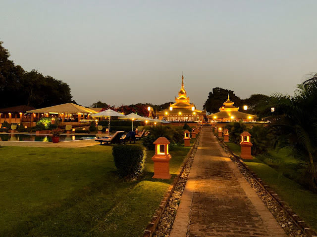 在Inle Lake住的飯店是歐洲殖民風,這家Hotel@Tharabar Gate是東方度假風,園藝做的很美,綠樹如茵,在綠意盎然的花園小徑走路滿寫意的,讓人感覺好像遠離塵囂、庭院深深,但其實卡拉OK飯店就在隔壁,晚上常傳來勁歌熱舞聲,和隔壁學校的下課鈴聲,半夜大概20分鐘就響一次,有點恐怖。