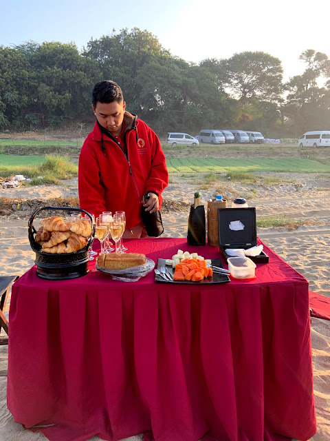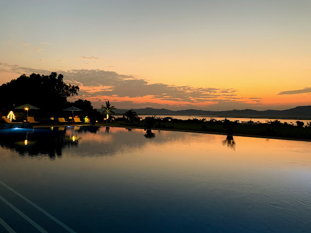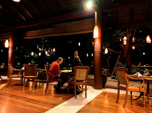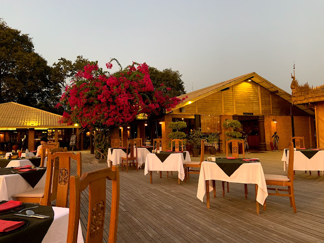 懶得搭船看夕陽,朋友提議選一家伊洛瓦底江邊的飯店看夕陽,於是就選了這家日本合資的飯店。Bagan Thiripyitsaya Sanctuary Resort有種窗明几淨的高級感,不過風格比較死板,沒有我們飯店這麼有南洋情調。它的好處是戶外餐廳在一個光禿禿木平台上,看得到遠方的花花草草,但比較不會有蚊蟲,不像我們的飯店太大自然了,戶外座椅直接在樹下,感覺會被叮得滿腿包。
