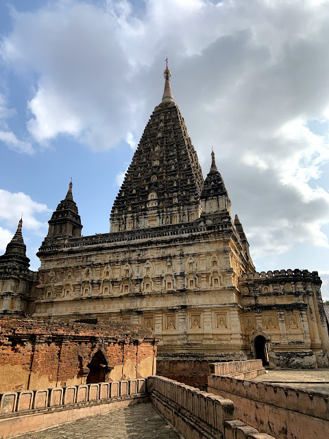 跟其它蒲甘的寺廟不同,Mahabodhi Paya是印度廟形式,模仿印度菩提迦耶的摩訶菩提寺,後者是記念佛陀悟道的地方。塔上有很多一格一格的雕刻,跟緬甸的佛塔比起來很繁複,但跟真正印度廟的密集恐懼風格雕刻比起來還算是簡單版,這座廟是一座小廟。